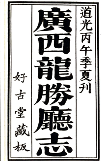 广西省桂林市龙胜各族自治县地方志, (道光)龙胜厅志一卷 (清)周诚之纂修。有道光26年(1846年)好古堂刻本,有民国25年 (丑936年)影印本和1967年台湾成文出版社据民国本影印本传世。《龙胜厅志》是龙胜厅第五十八任通判周诚之于清道光二十六年(一八四六年)撰写并刊印。周诚之, 除置龙胜厅外,当年清廷另设义宁协驻龙胜,防范少数民族起义。